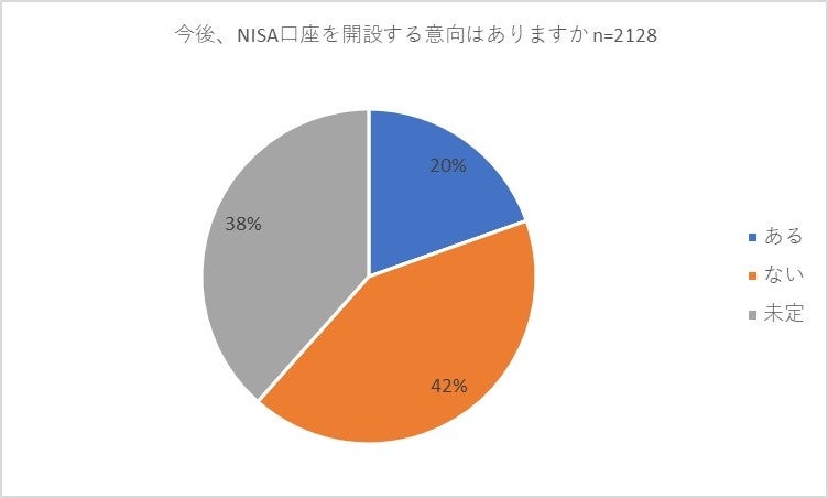 最後に、初めの質問でNISA口座を「開設していない」と回答した2128人に対し「今後、NISA口座を開設する意向はありますか」と尋ねました。その結果「ない」との回答が42パーセントでトップ。次いで「未定」が38パーセントで続き、「ある」との回答は20パーセントに止まりました。