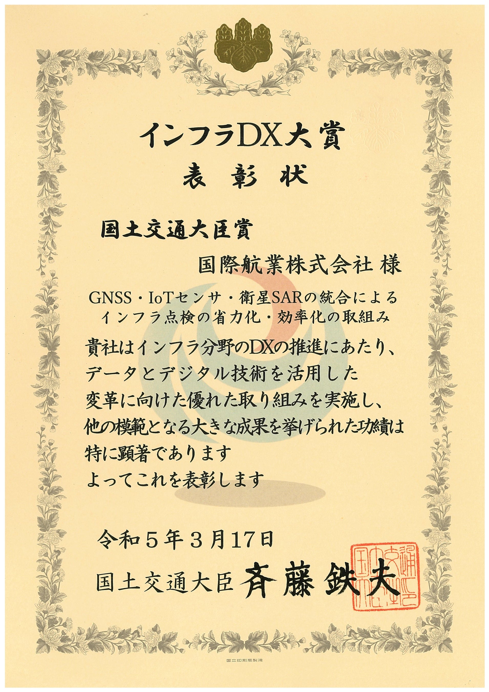 国際航業株式会社(代表取締役社長:土方 聡、以下「国際航業」)は、国土交通省より、令和4年度 インフラDX大賞「国土交通大臣賞」を受賞しました。