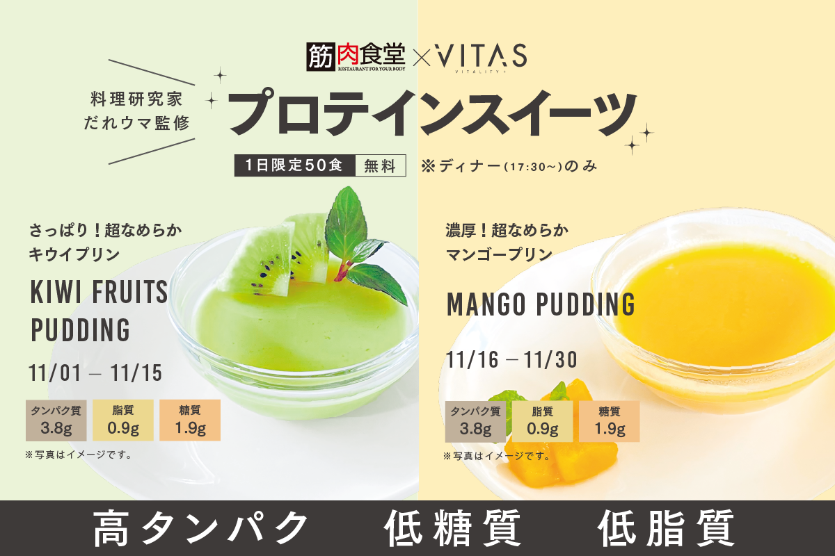 コラボ実施期間の11/1(水)〜11/30(木)は、渋谷MIYASHITA PARK店のウェルカムドリンクにVITAS DELICIOUS PROTEIN(デリプロ)が提供されます。提供スケジュールは明日11/1(水)に筋肉食堂とVITASの公式Instagram、X(旧Twitter)で告知いたしますので、情報解禁をお待ちくださいませ。