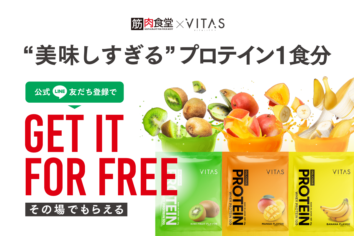 期間中、店内掲示の三角柱POPに記載されているQRコードからVITAS公式LINEの友だち登録をしていただいた方に、DELICIOUS PROTEIN個包装を配布いたします。