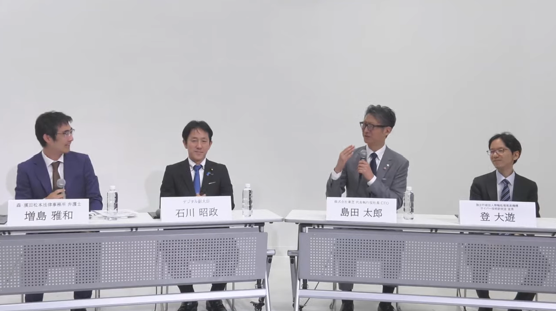出演者:島田太郎氏(株式会社東芝 代表執行役社長CEO)、登大遊氏(独立行政法人情報処理推進機構 サイバー技術研究室 室長)、増島雅和氏(森・濱田松本法律事務所 弁護士(モデレーター))、石川昭政デジタル副大臣