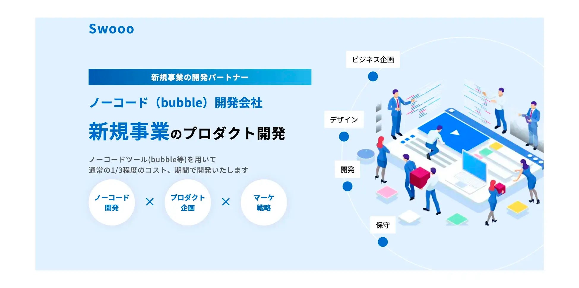 SwoooはBubble Group, Incが提供するノーコードプラットフォーム「Bubble」の正規代理店として認定されています。この認定により、より幅広い開発領域での活動が可能となり、高品質な成果物を提供できるようになりました。