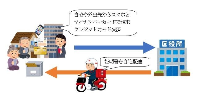 自宅などからスマートフォンでの申請を可能とし、マイナンバーカードの公的個人認証を利用した本人確認とクレジットカードを利用した手数料のオンライン決済後、申請のあった証明書を住民登録のある自宅に郵送。請求から受け取りまで外出が不要となります。