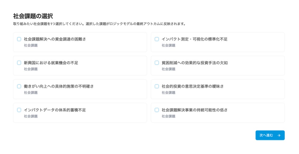 最終アウトカムに最も近い社会課題を特定します。SaaSが生成した複数の社会課題候補のなかから選択可能です