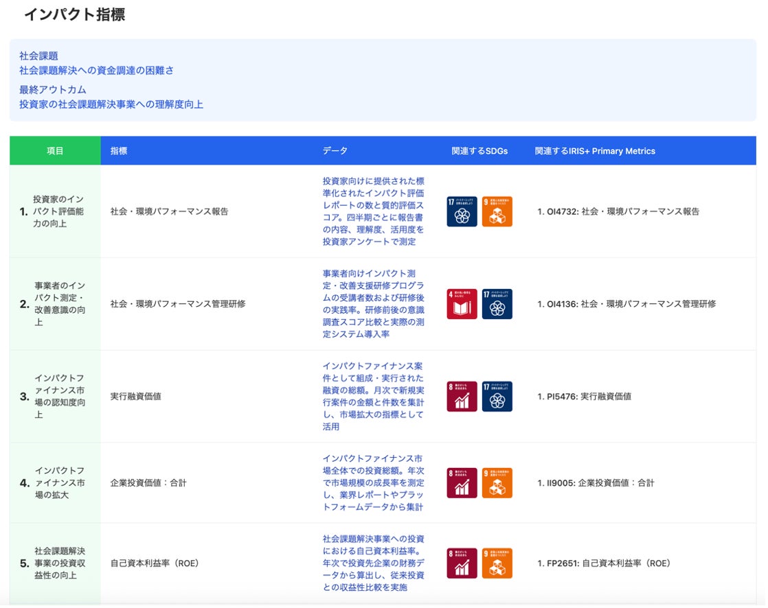 ・インパクト可視化サービス/プラットフォームの提供 ・インパクト可視化型ファイナンスの提供 |