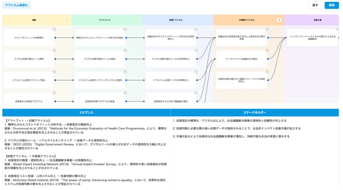 特定した社会課題と取り組み(アクティビティ)から当社に蓄積されたベストプラクティス群等を参照し、ロジックモデルを⾃動⽣成します また、ロジックモデル生成において参照したエビデンス等表示する機能を強化しています |