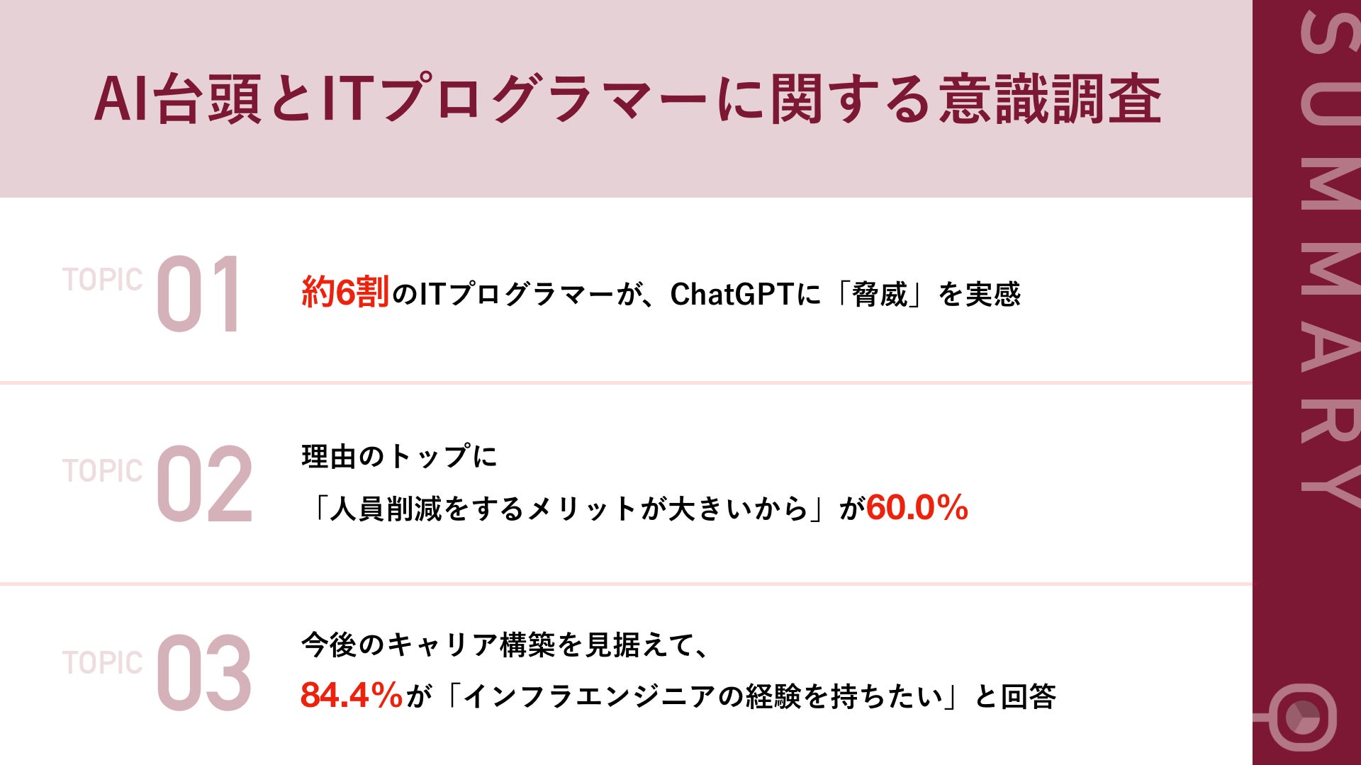 まず、約6割のITプログラマーが、ChatGPTによって、「プログラマーの仕事がなくなってしまう」という脅威を感じていることがわかりました。脅威を感じている理由としては、6割が「人員削減をするメリットが大きいから」と回答。また、約9割がITプログラマーの仕事に求めらえるスキルが上がると実感しており、ChatGPTが台頭してくるとした場合には、「プログラミングスキルをさらに突き詰める」や「マネジメントスキルを身につけたい」といった声が挙がってます。加えて、今後ChatGPTが勢いを増していく際のキャリア構築を見据えて、サーバーやネットワークなどのIT基盤やハードウェアを取り扱うインフラエンジニアの経験を持ちたいと思っているITプログラマーは8割強いる結果となりました。