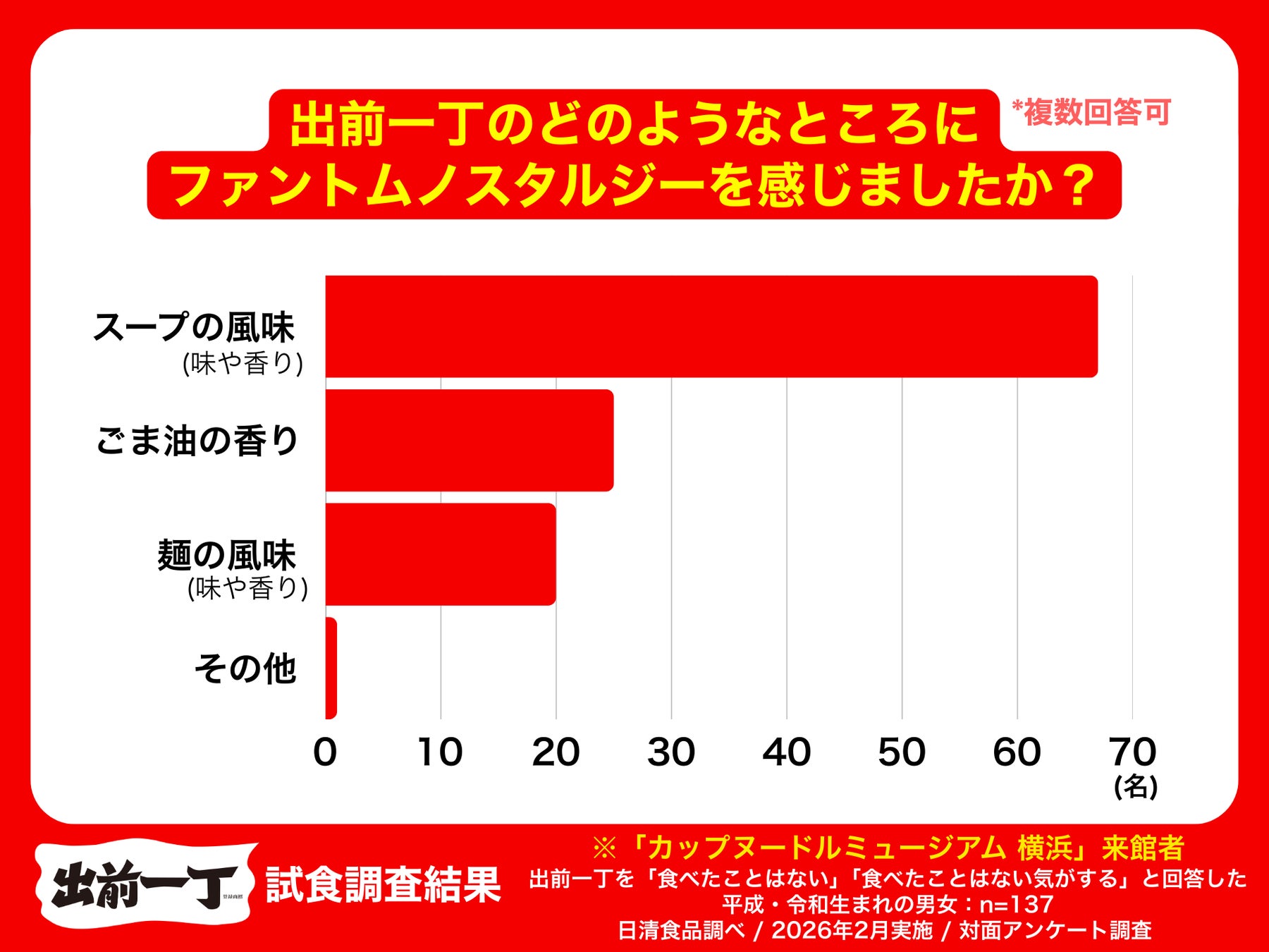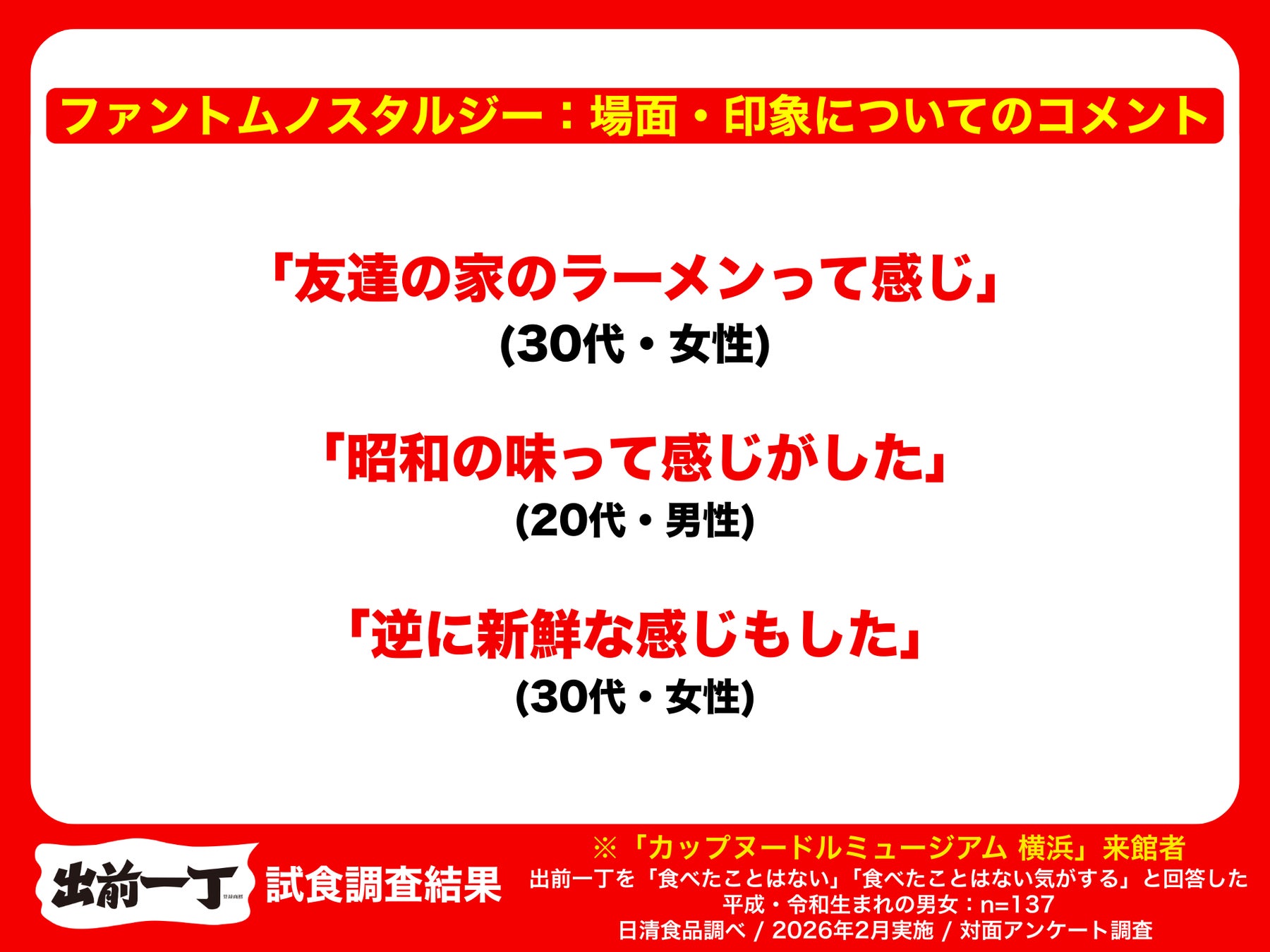 2026年2月4日(水)、「カップヌードルミュージアム 横浜」で「出前一丁」の試食アンケート調査を実施しました。本調査では、昭和を知らない世代で、かつ「出前一丁」を過去に食べたことがない137名の回答を抽出して分析しました。