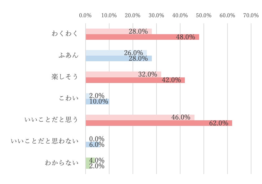 「自分たちとは文化や特徴が異なる人たちと触れ合うことをどう思うか?」という質問に対し、体験後は「わくわくする」「楽しそう」と答えた生徒の割合が増加。特に「わくわくする」は20ポイント増、「いいことだと思う」も16ポイント増と、多様性を前向きに捉える生徒が増えました。