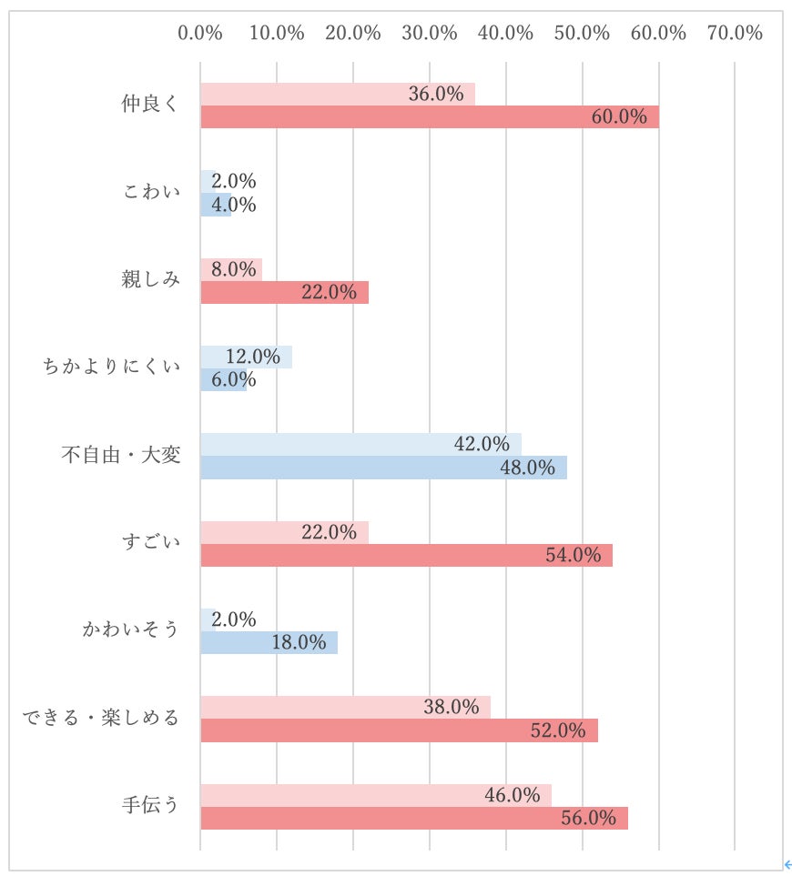 一方、「不自由・大変」や「かわいそう」との回答も増加しましたが、これは親近感が増したことで当事者の視点に寄り添う気持ちが高まった結果と考えられます。