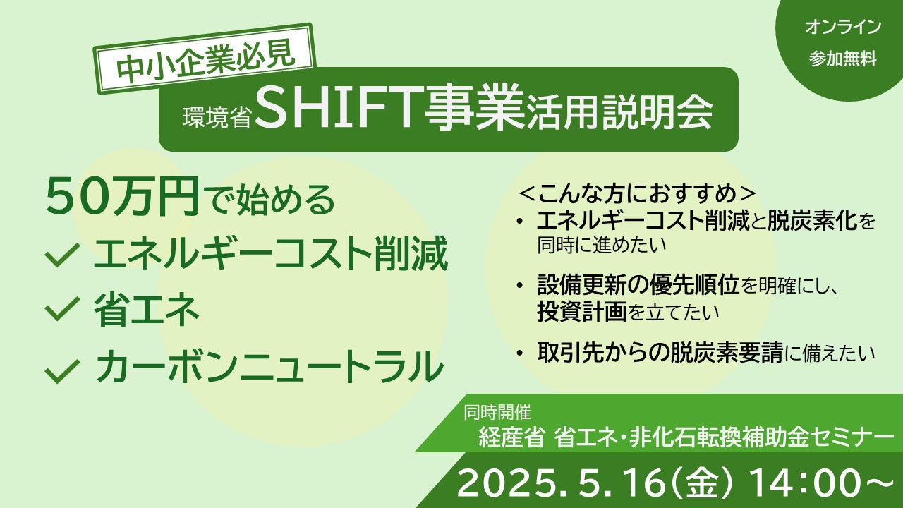 中小企業の脱炭素化を多角的に支援している株式会社エネルギーソリューションジャパン(東京都中央区、代表取締役:田崎剛史)は、現在公募中の環境省SHIFT事業を活用して、約50万円の自己負担でエネルギー見える化と脱炭素対策を実現する「カーボンニュートラルスタートパック」の説明会を2025年5月16日(金)に開催します。公募締切が迫る中、コスト削減と脱炭素化を同時に進めたい中小企業経営者必見のセミナーです。