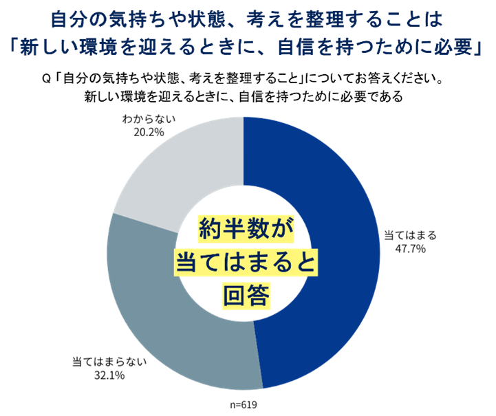 こうした背景から、自分の印象をポジティブにしていくために「自分の気持ちや状態、考えを整理すること」は重要な行動といえます。実際に、「新しい環境を迎えるときに、自信を持つために必要」と回答した人は約半数(47.7%)にのぼりました。なかでも30代では51.3%と最も高く、役割や責任の変化を感じやすい世代でその必要性が強く認識されているといえます。一方で、実際に「整理の時間を取れている」と回答した人は全体の35.9%にとどまりました。