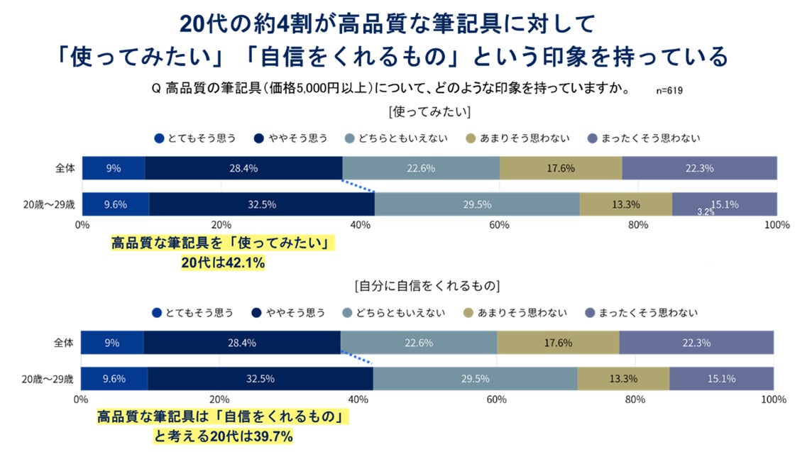 さらに、20代の約4割は高品質な筆記具は「自分に自信をくれるもの」と捉えていること も明らかに。