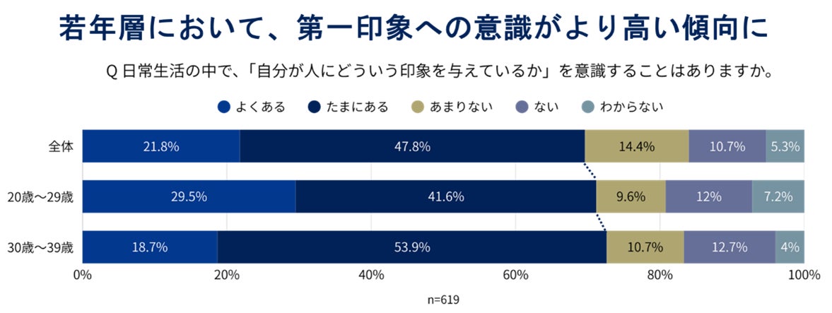 日常生活の中で、「自分が人にどういう印象を与えているか」を意識している人は69.6%にのぼりました。第一印象は、多くの人にとって日常的な関心事であることがうかがえます。なかでも20代(71.1%)、30代(72.7%)はいずれも7割超が意識していると回答しており、全体平均を上回る結果に。若年層において、第一印象への意識がより高い傾向が見られます。