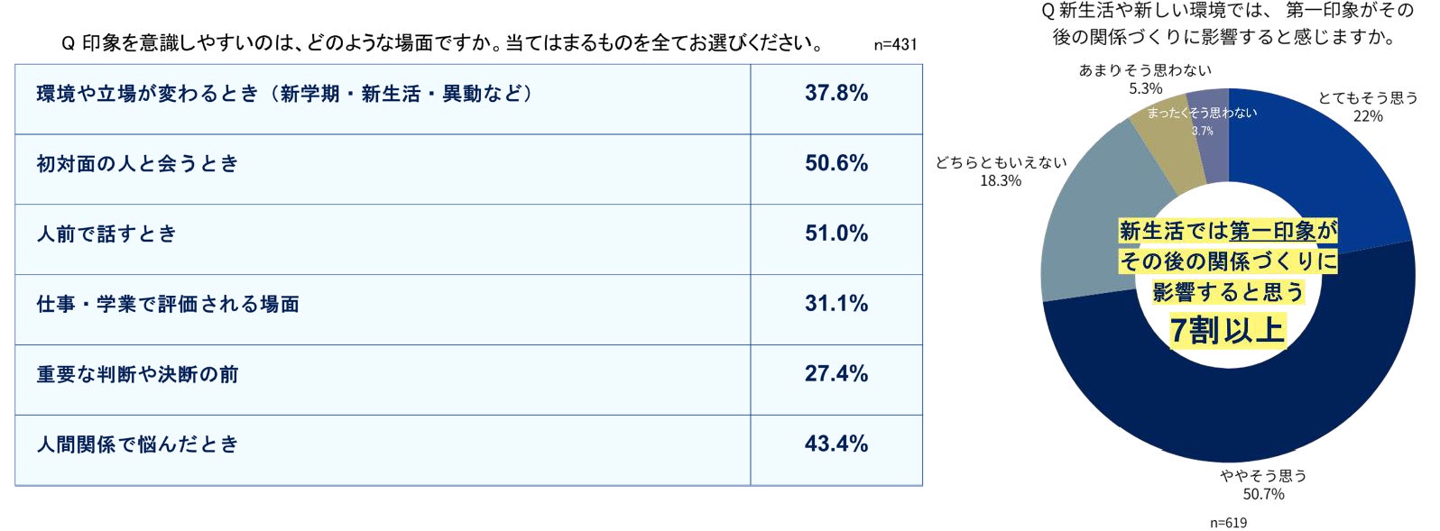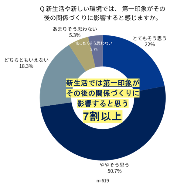 加えて、「新生活や新しい環境では、第一印象がその後の関係づくりに影響する」と感じている人は72.7%にのぼりました。環境の変化が生じやすい新生活シーズンは、第一印象の重要性がより強く意識される時期といえます。