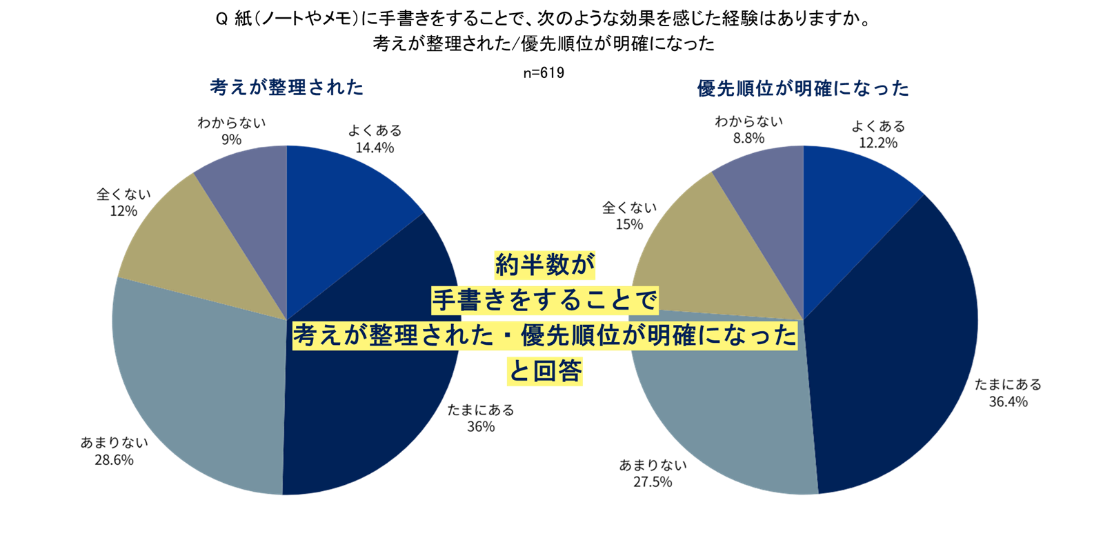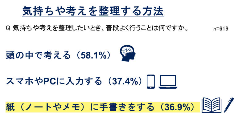紙のノートやメモに手書きをすることについて「考えが整理された」が50.4%、「優先順位が明確になった」が49.1%と、約半数が効果を感じていることが明らかになりました。