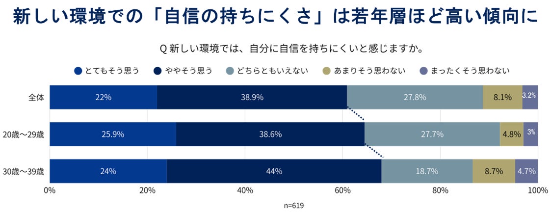 ② 新しい環境での「自信の持ちにくさ」は若年層ほど高い傾向に。