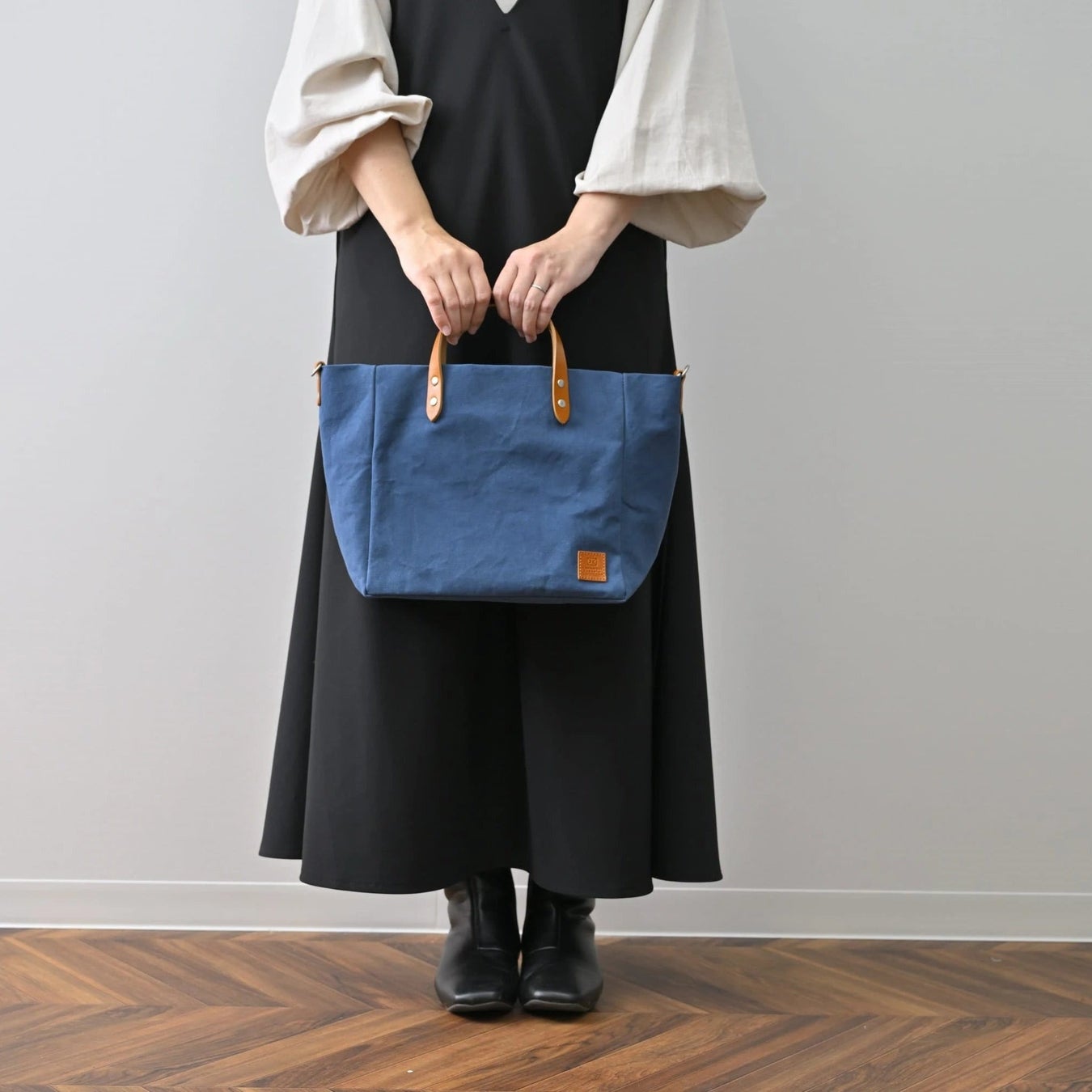 生地には一度洗いをかける「ウォッシュ加工」を施し、ほどよくこなれたシワ感と柔らかな風合いを実現しました。上品な大人帆布の質感はそのままに、カジュアルすぎない絶妙なバランスに仕上がっています。キャメルレザーの持ち手とも好相性です。