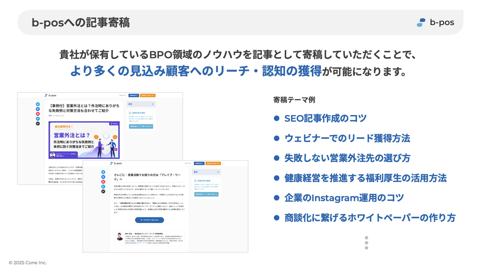 株式会社Cone(本社:大阪府大阪市、代表取締役:佐藤 立樹、以下「当社」)は、BPOサービス比較サイト「b-pos(ビーポス)」に、記事寄稿・お役立ち資料掲載の機能を追加したことをお知らせします。