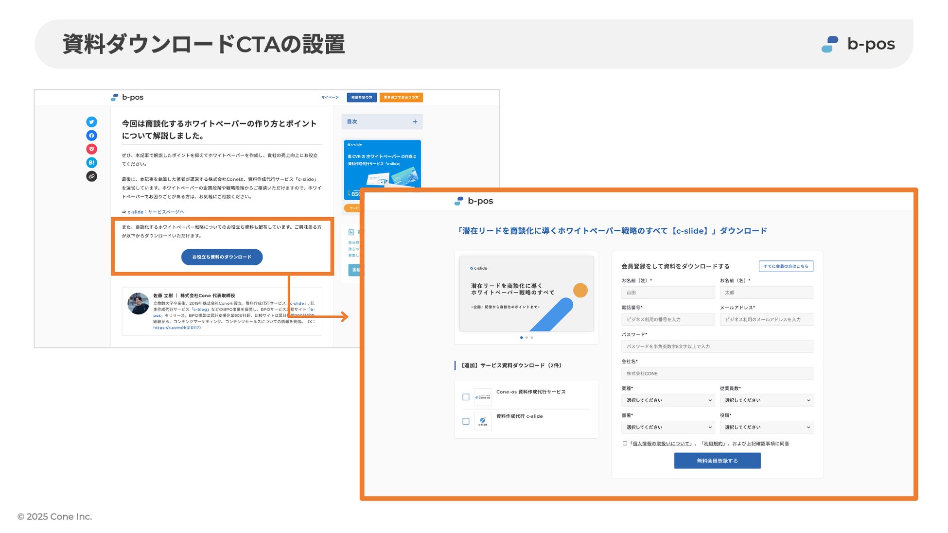 b-posに掲載しているサービス紹介資料やお役立ち資料などの資料ダウンロードを促すCTAの設置が可能です。寄稿いただくテーマに沿ったお役立ち資料を掲載することで、資料ダウンロードからの認知獲得を行うことができます。