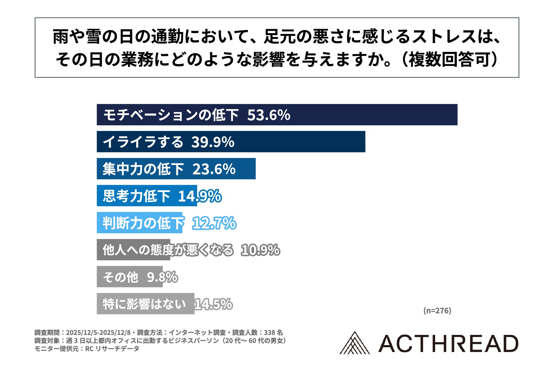 また、雨や雪の日の通勤において、足元の悪さにストレスを感じる人を対象に「雨や雪の日の通勤において、足元の悪さに感じるストレスは、その日の業務にどのような影響を与えるか」を尋ねる設問への回答では、1位が「モチベーションの低下」で53.6%、2位が「イライラする」で39.9%、3位が「集中力の低下」で23.6%という結果になりました。この結果から、雨や雪の日の通勤において、足元の悪さによるストレスが、その日の業務に与える主な影響は、「モチベーションの低下」や「イライラすること」であることが判明しました。