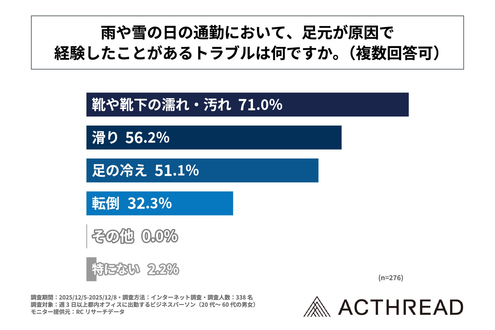 Z&Kトレーディング株式会社(本社:東京都台東区、代表取締役:金 紅成)が運営する「ACTHREAD」は、週3日以上都内オフィスに出勤するビジネスパーソン(20代~60代の男女)を対象に「ビジネスパーソンの雨の日や雪の日の足元ストレスに関する調査」を実施しました。この調査から、都内で働くビジネスパーソンの雨や雪の日の通勤における「足元の悪さ」の実態や、そのストレスが業務に与える影響、ストレスを感じない人が実践している対策などが明らかになりました。