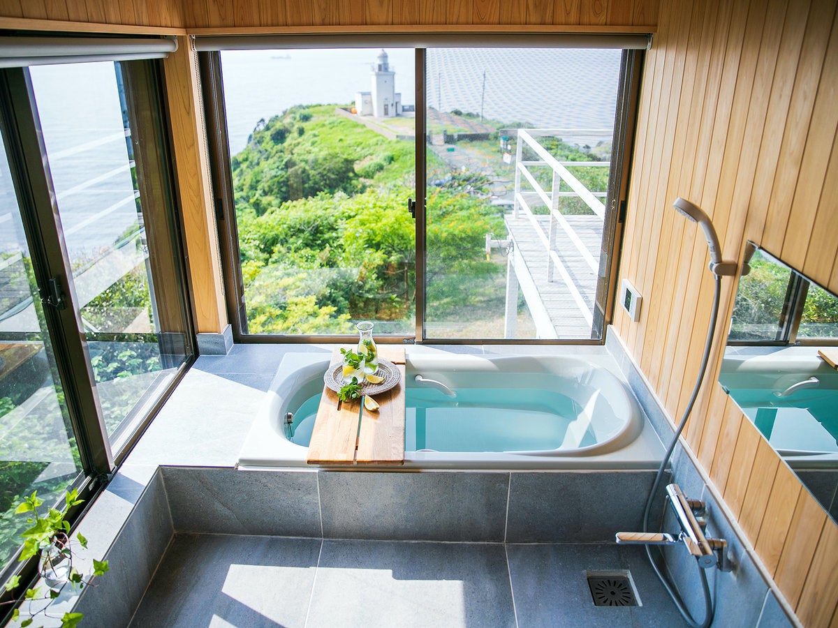 浴室は壁面と床タイルを改修し、ヒノキの香りでリラックス効果を高めます。窓の外には、大島の大自然が広がります。ゆっくり湯船に浸かりながら、癒しのひとときをお過ごしください。お部屋でゆっくり過ごすなら、鍼灸と