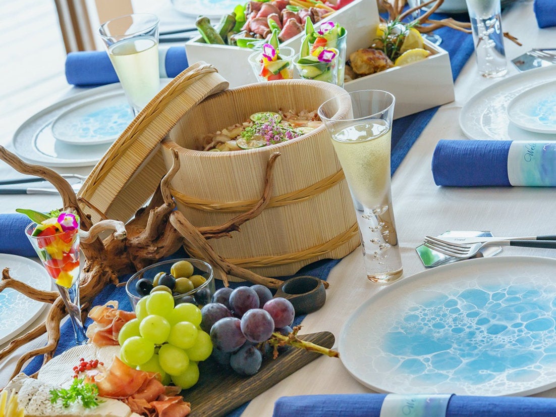 オプションでお申し込みいただけるお食事コースは一品ずつ地産地消を第一に考え、新鮮な玄界灘の天然地魚や旬の食材を使用。その素材の良さを生かしつつ、地元で人気の調味料で一工夫することにより、他にはない新たな地産地消のコラボレーションが生まれました。前菜からデザートまで大島を存分に味わえるメニューとなっております。ワインセラーには、ワイン業界の最高峰、マスター・オブ・ワイン(※)のお店「山仁」にセレクトしていただいた、ワインや日本スピリッツ等を適正な温度で保管しております。