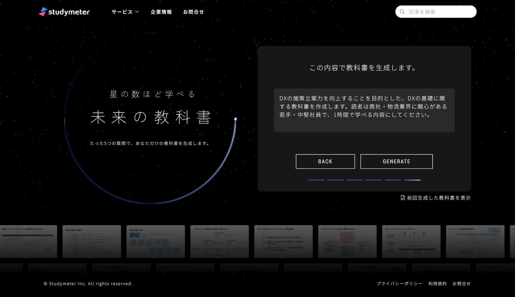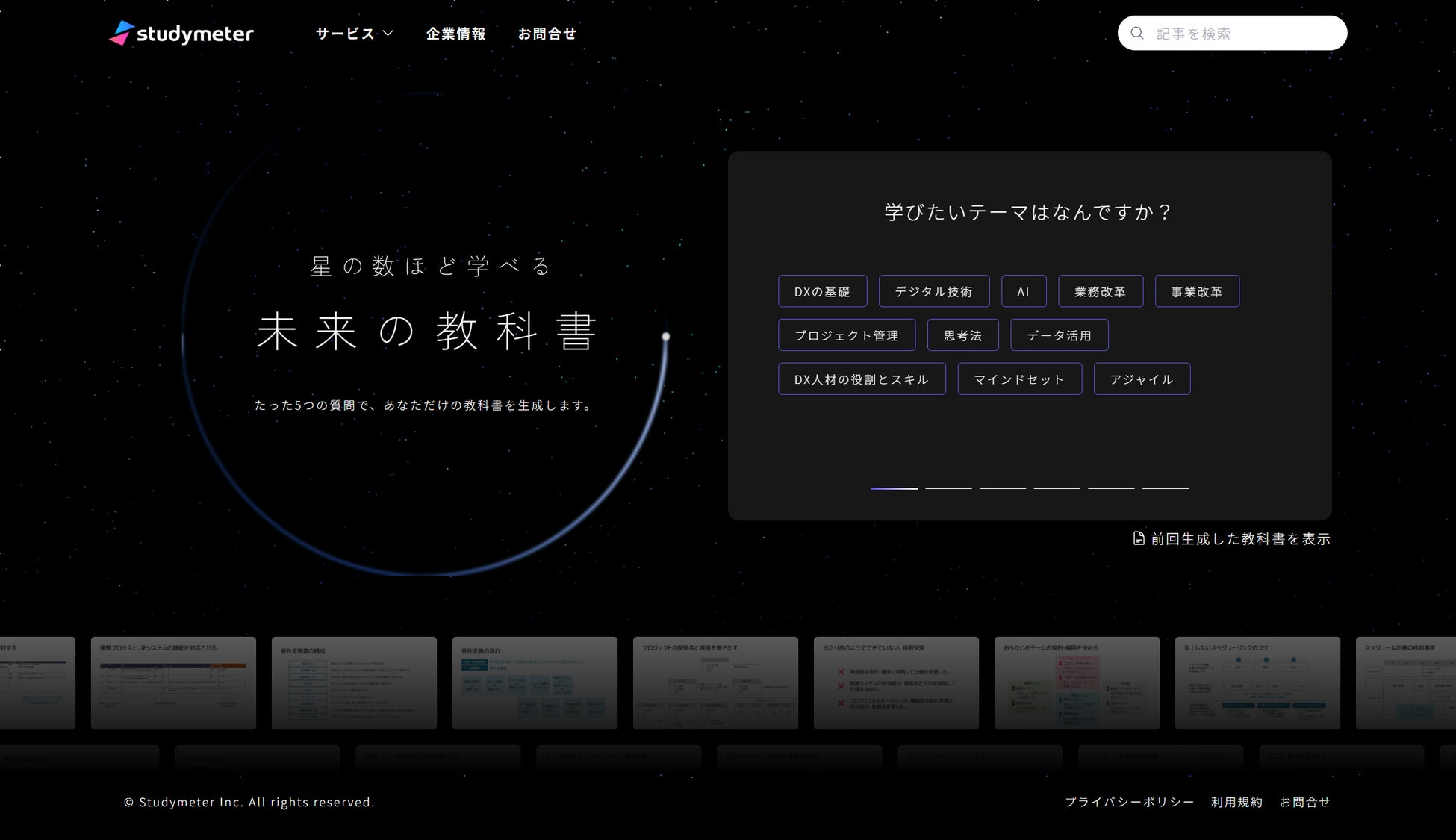 スタディメーター株式会社は、DX(デジタルトランスフォーメーション)を学ぶための新サービス「未来の教科書」を公開しました。このサービスは、公式サイト(https://studymeter.jp)から誰でも無料で利用することができ、AIがユーザーのニーズに合わせた教科書を自動生成するシステムです。