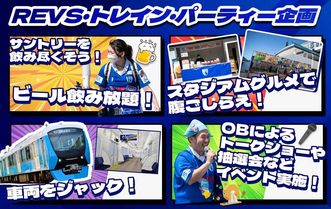 試合前から盛り上がろう!貸切レヴニスタ号「REVS・トレイン・パーティー」と題した本企画は、本プレシーズンマッチのために静岡鉄道A3001号を貸切運行し、ここでしか味わえない特別な体験をセットにした限定乗車券として販売いたします。