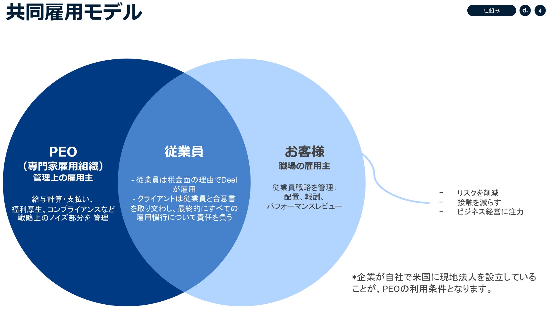 Deelと米国法人を持つ会社で従業員を共同雇用し、会社は通常通り従業員へのオペレーションやマネージメントを行い、Deelは給与計算や給与支払い、納税、コンプライアンス管理や福利厚生のサポート管理を行います。