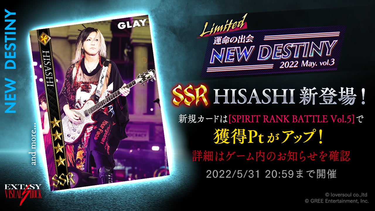 今回の「運命の出会」では、新規カード SSR[25th Anniv. "LIVE DEMOCRACY" 2]HISASHI が登場!期間中、このカードは他のSSRカードより「運命の出会」からの出現率がアップします!