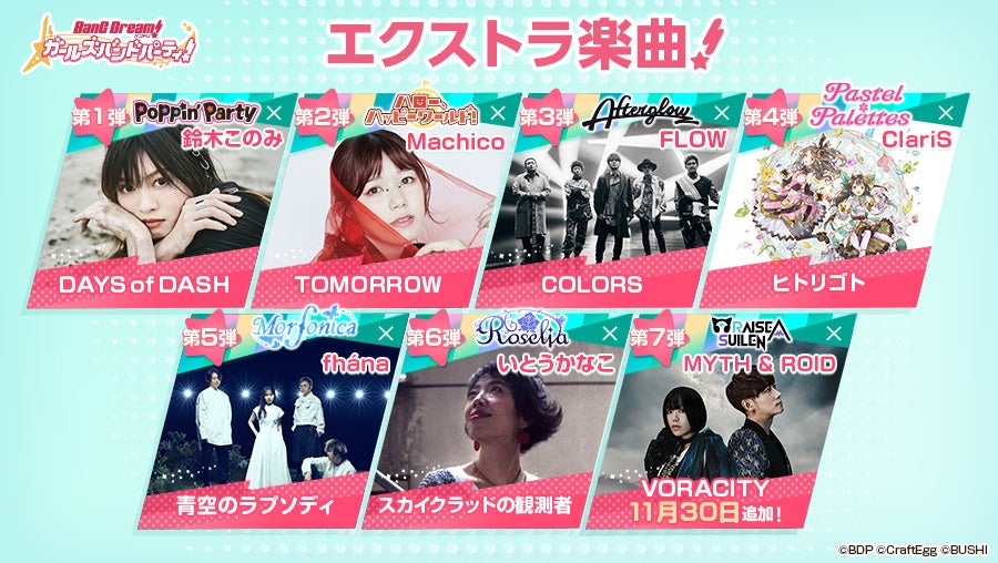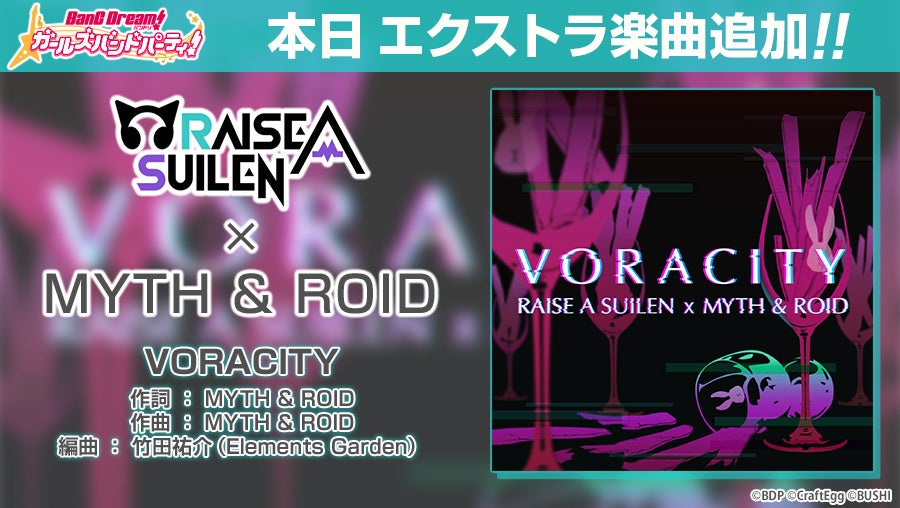 株式会社Craft Egg(本社:東京都渋谷区 代表取締役:森川 修一、以下、Craft Egg)と、株式会社ブシロード(本社:東京都中野区 代表取締役社長:木谷高明、以下、ブシロード)の共同制作によるスマホゲーム「バンドリ! ガールズバンドパーティ!」(以下、ガルパ)は、2022年11月30日(水)より、エクストラ楽曲第7弾として、RAISE A SUILEN(Ba.&Vo.レイヤ/CV.Raychell)とMYTH & ROIDさんが歌うエクストラ楽曲『VORACITY』をゲーム内に追加いたしました。