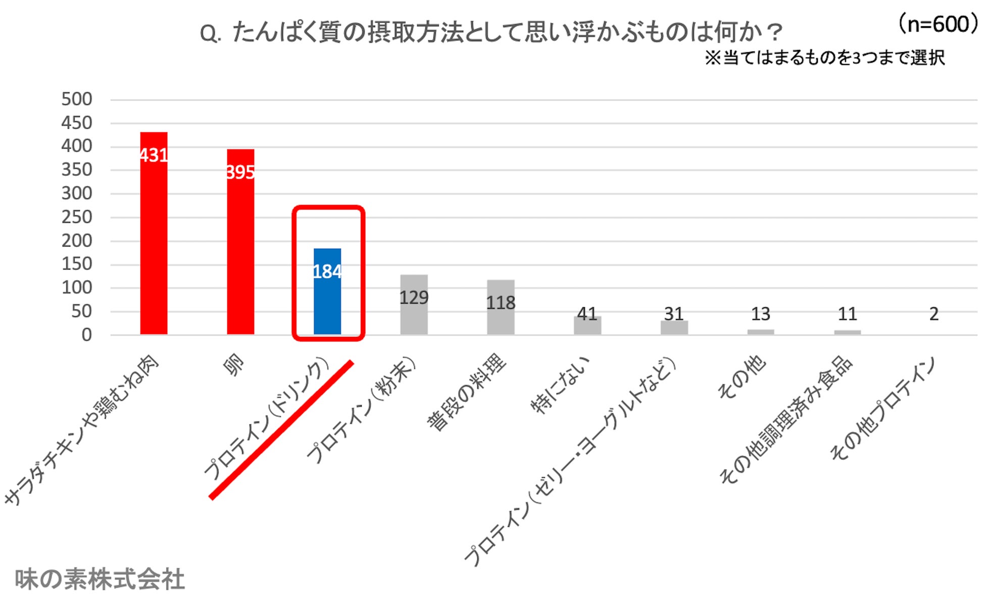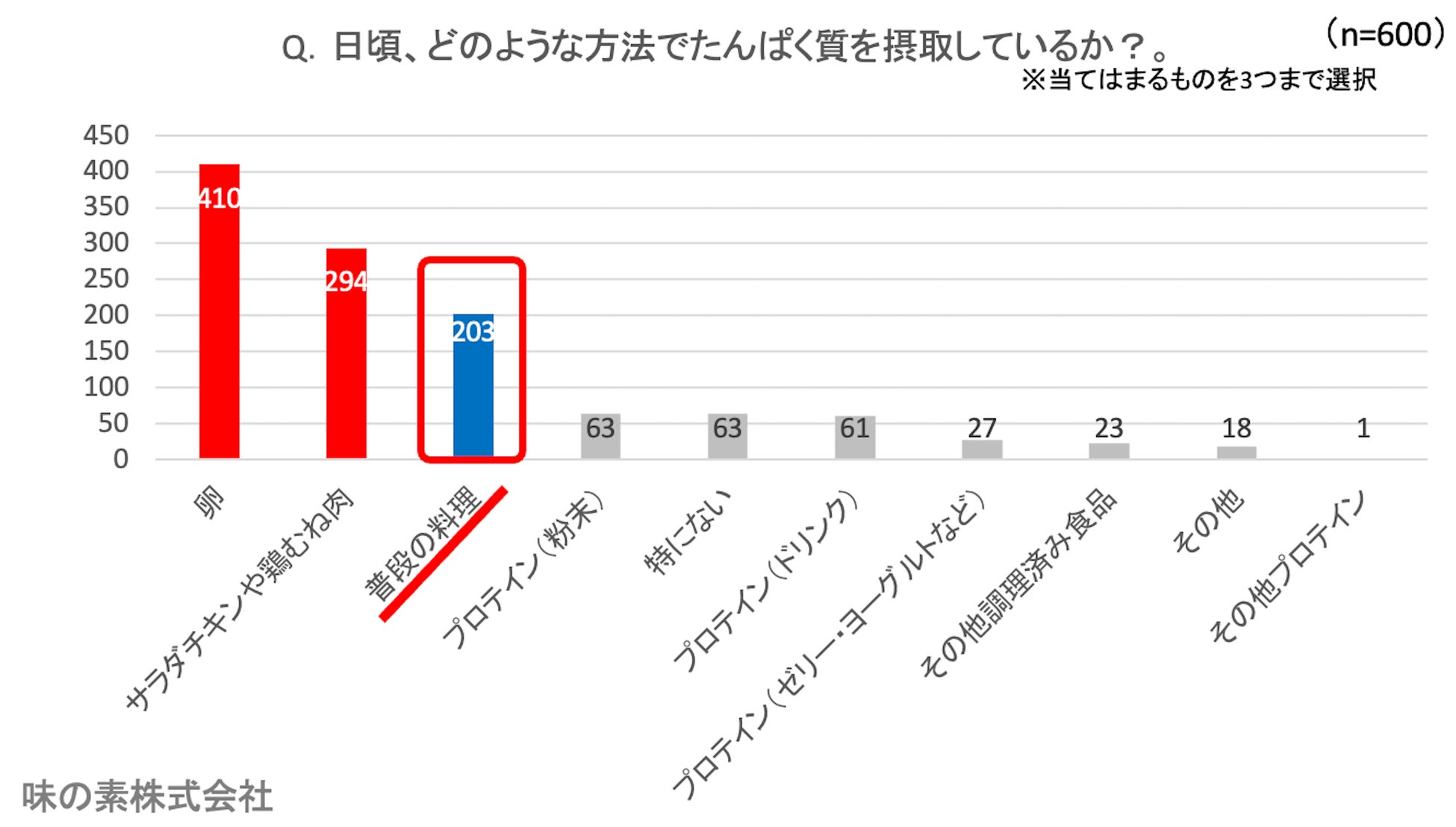 ■実際にどのようにしてたんぱく質を摂取しているか聞いたところ、上位から順に「卵」「サラダチキンや鶏むね肉」などの固形の食品となり、3番目に多かったのは、たんぱく質の摂取方法として想起する人が多かった「プロテイン」ではなく、「普段の料理(食事)」という結果に。