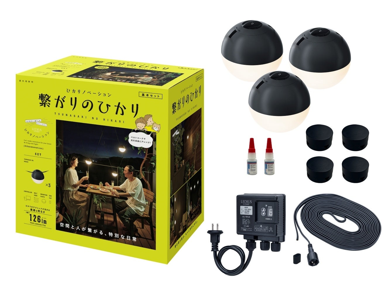 ベルトコードを使って好きな位置に灯具を取り付けられる球状のライトで、ペンダント、フロア、コーナーなどに活用領域を広げます。併せて、これまで自動点灯だったローボルト(低電圧)配線にON/OFFの切り替えができるスイッチを追加します。これにより、従来の戸建て住宅だけでなく、マンションやオフィスのベランダ、店舗などの需要を開拓します。「繋がりのひかり」の価格は、灯具3個とコントローラーなどが入った基本セットが27,500円(税込)、ON/OFFスイッチが2,970円(同)。