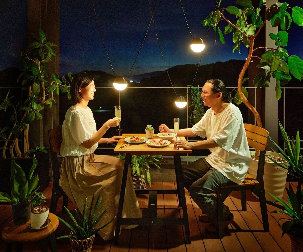 「ひかりノベーション」の暮らしシリーズは2023年11月に、自由に手元や対象物を照らせる「活動のひかり」、置き型の「語らいのひかり」、内壁や段差を照らすライン(棒)状の間接光「憩いのひかり」を発売しており、今回が初の拡充となります。これまでは戸建て住宅のデッキやテラスの需要が圧倒的に多く、住宅全体の半分近くを占める共同住宅(マンション)の需要にこたえきれていなかったことが背景にあります。「繋がりのひかり」は、光を宙に浮かせて多様なレイアウトを楽しむことができるため、マンションやオフィスのベランダ、店舗での利用を促します。