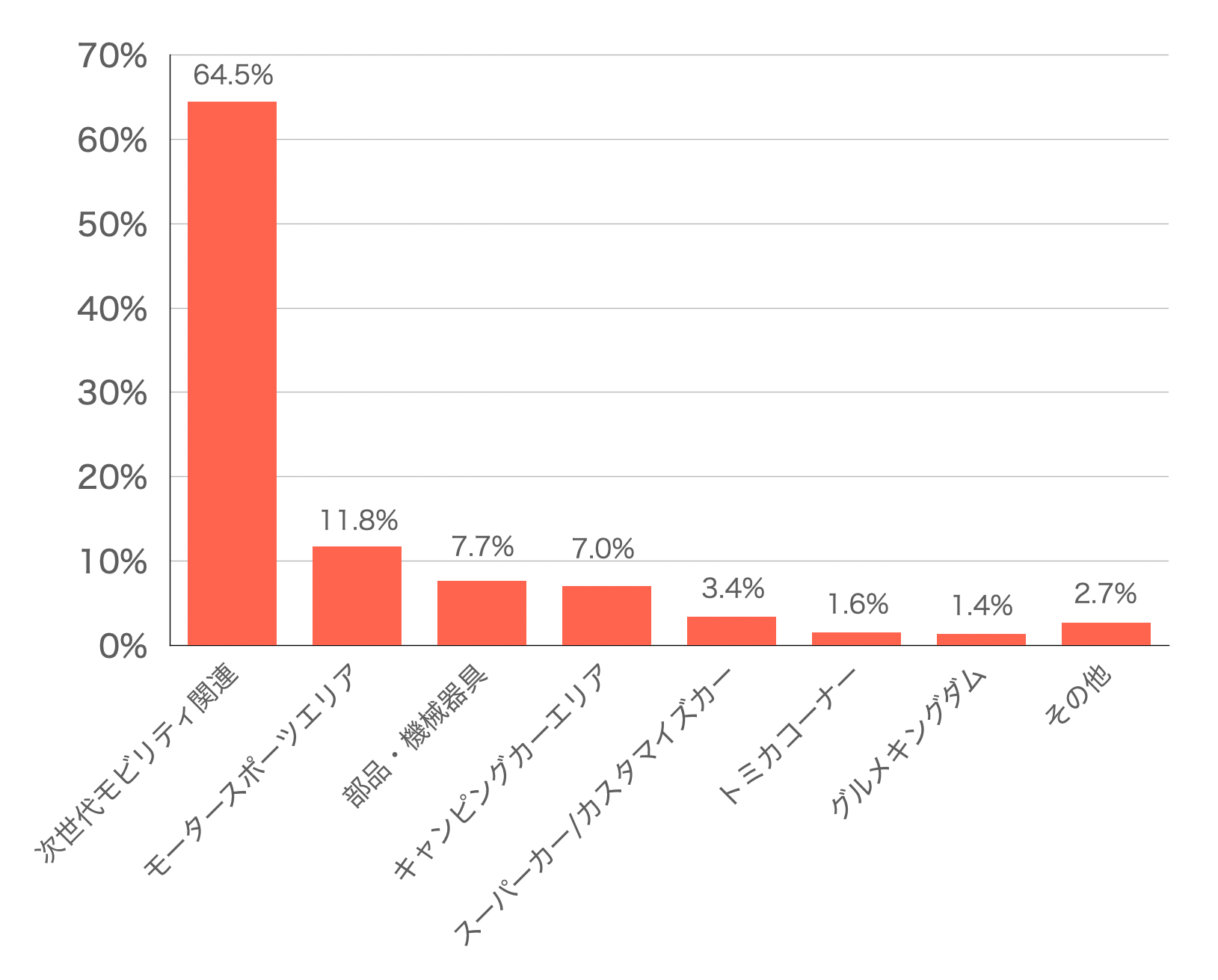 次世代モビリティ関連のエリアは来場者の注目を集め、約65%の来場者が最も興味を示しました。このエリアでは、最新のテクノロジーと未来の交通手段が展示されており、技術革新への高い関心がうかがえます。
