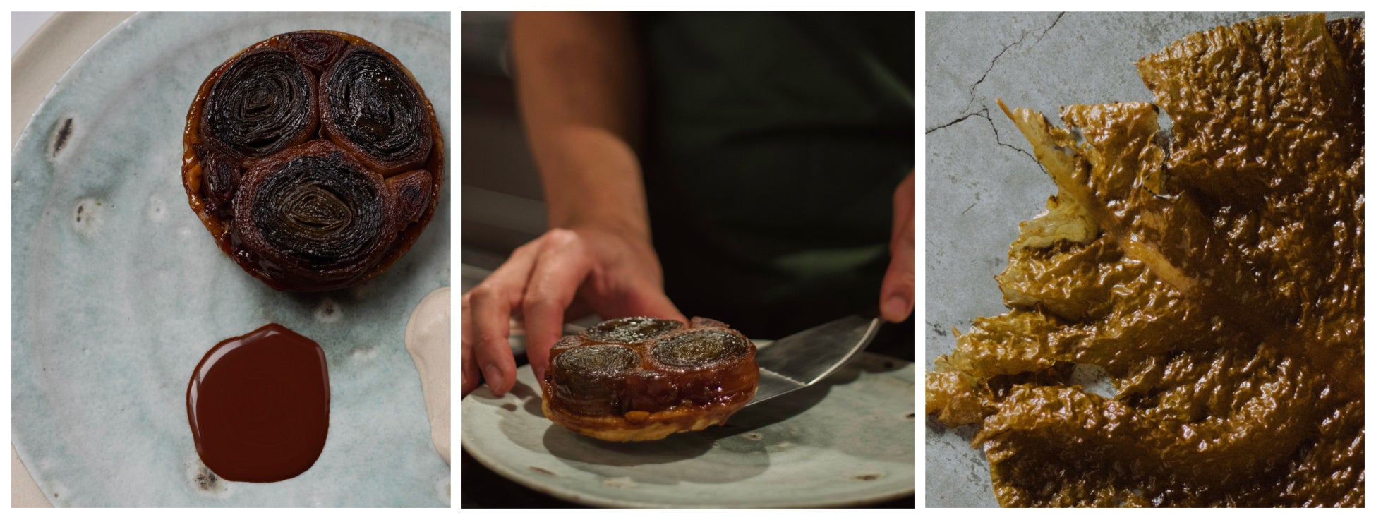 ほんのりと甘味を乗せた出汁で炊いたワカメと同属の海藻「ヒロメ」とリンゴの層が織りなすジューシーな食感が楽しい、シェリーの香りと昆布キャラメルを忍ばせて焼き上げたタルトタタン。焼きたての香ばしさが広がる旬の一皿です。横に添えられたチョコレートソースやカカオの生豆クリームと合わせるとリッチな風味が広がります。