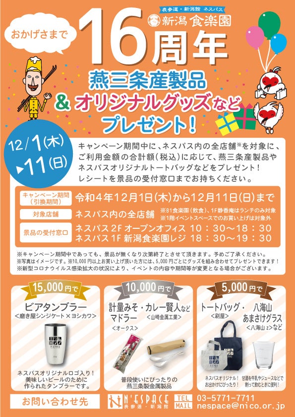 この度、表参道・新潟館ネスパス1F物産販売・B1お食事処「新潟食楽園」が16周年を迎えました。皆様からの日頃のご愛顧に厚く御礼申し上げます。