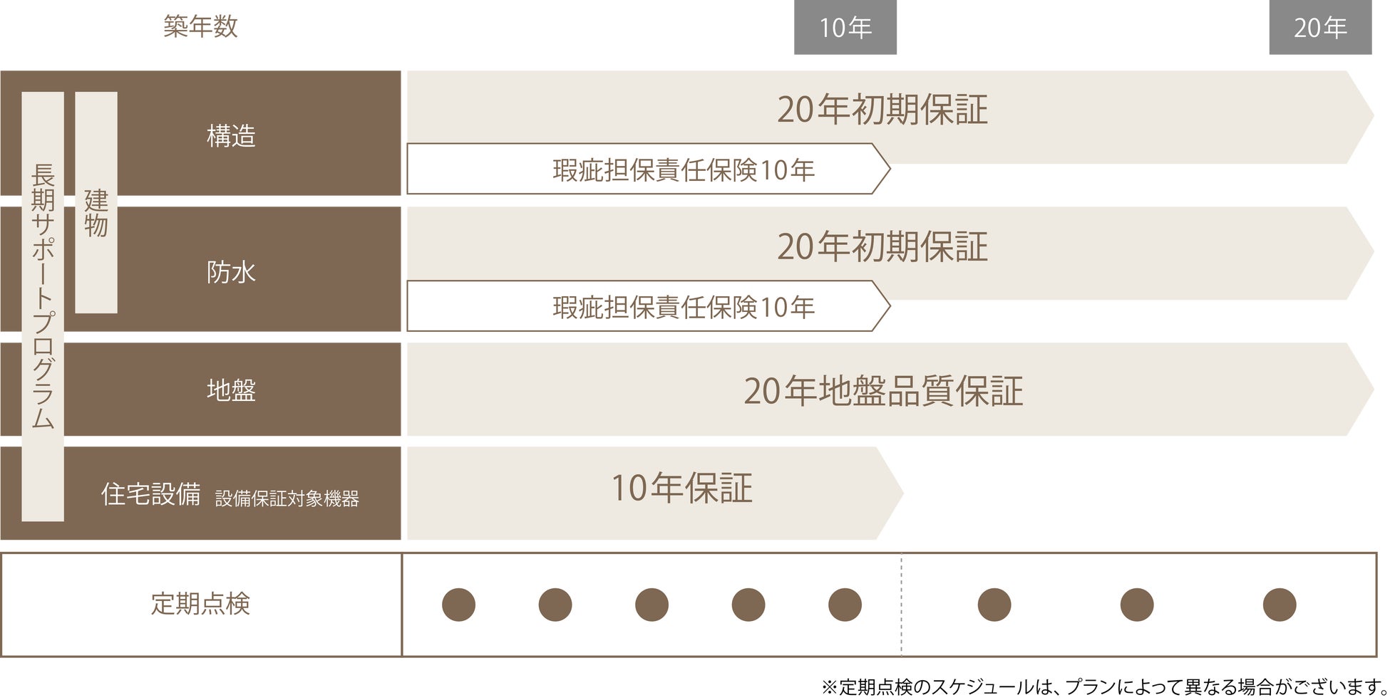 確かな住宅性能と定期的な点検・メンテナンスにより初期保証20年をご提供します。