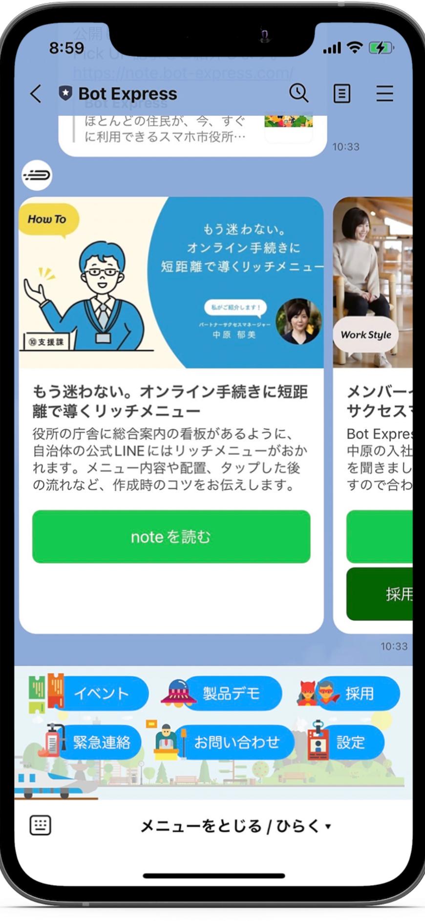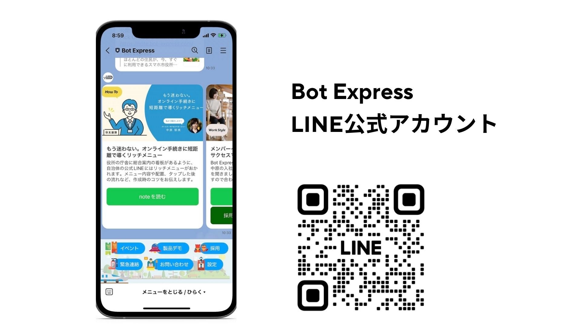 Bot Express LINE公式アカウントから、GovTech Expressの操作感を体験できます。事例共有イベント情報や最新の自治体事例などもメッセージでお届けします。