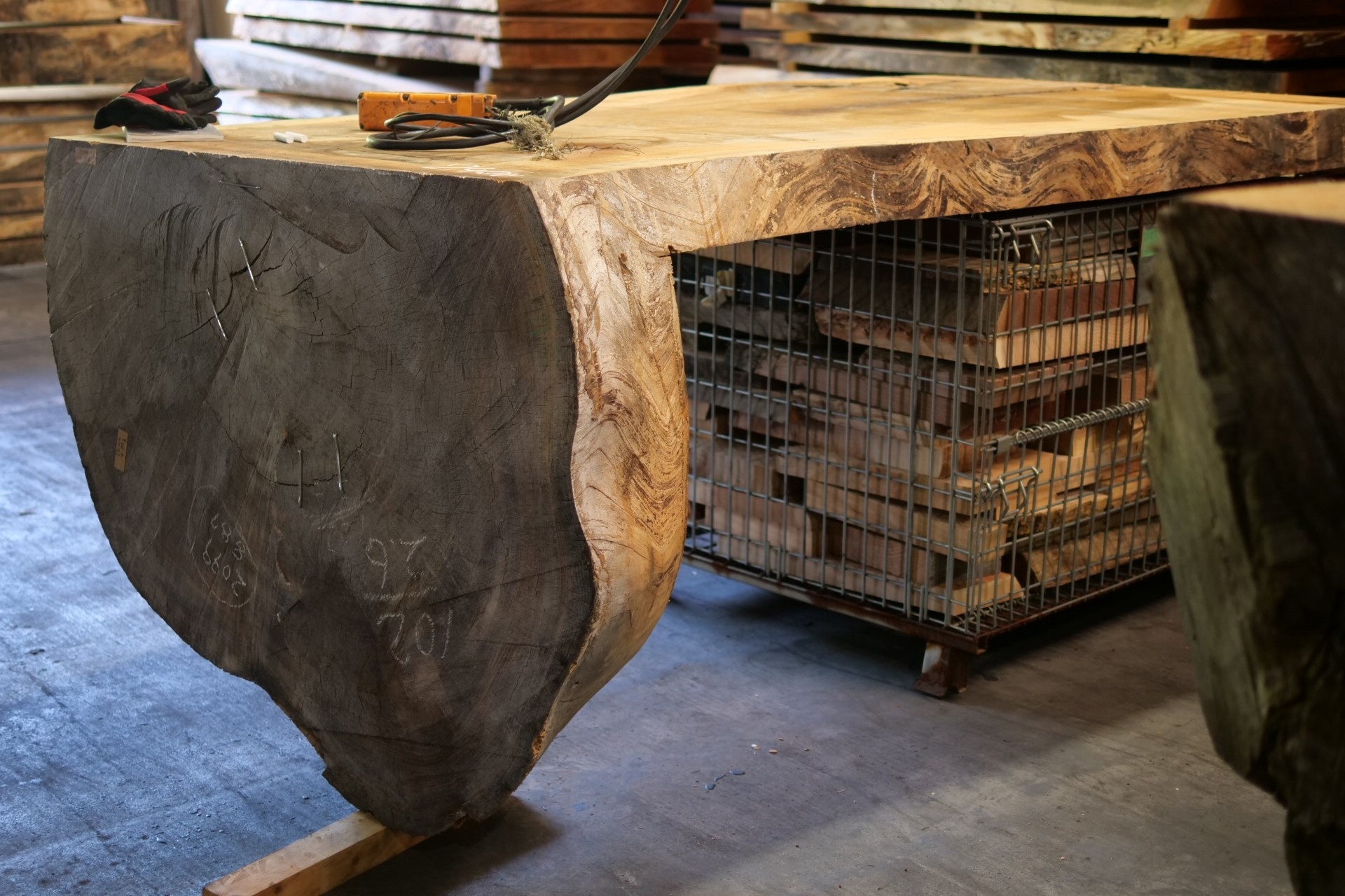 2025年3月に岡崎製材が開発・発表した新製品。丸太そのものの美しさを活かした革新的な木製テーブル・カウンターで、天板と脚部を継ぎ目なく一体で削り出し、無垢の魅力を最大限引き出した究極の一点物。