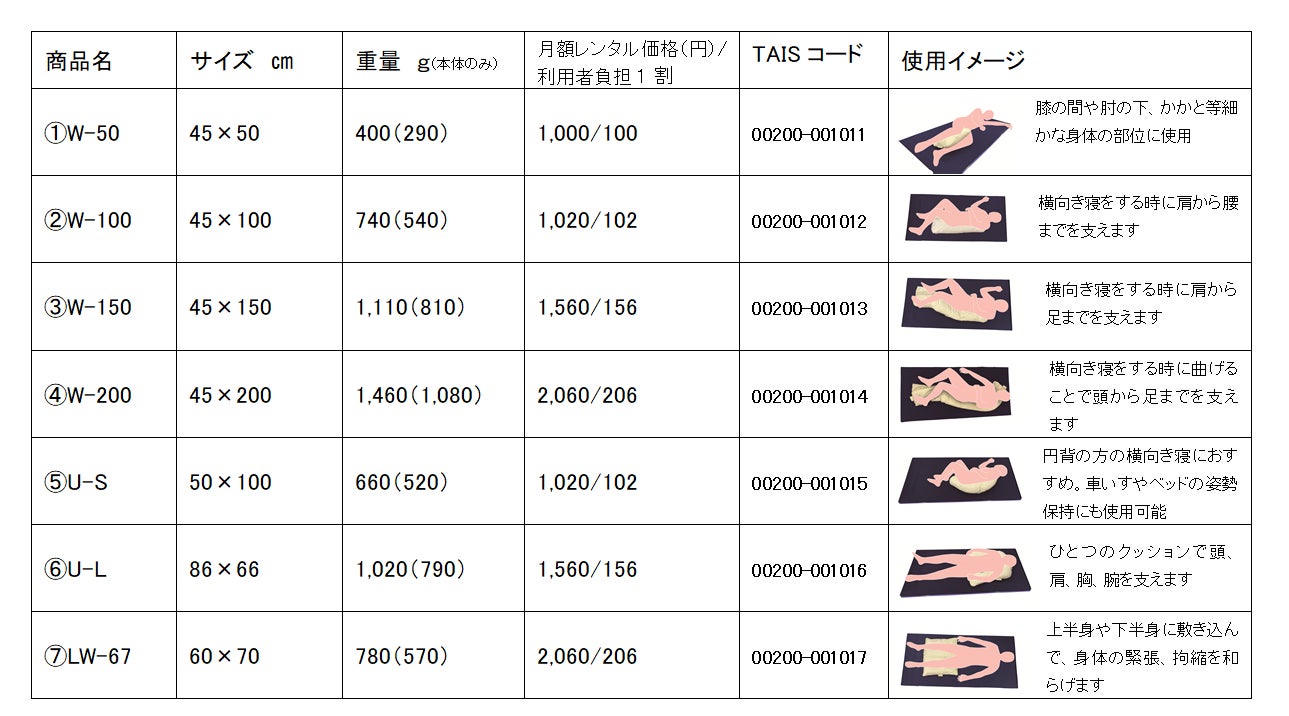 形状は、全部で7種類。全種類、体位変換器として介護保険でのレンタルにも対応し、細菌の増殖を抑制する制菌加工を施した本体は、触り心地の良いパイル地の防水カバーと共に家庭用洗濯機での洗濯・乾燥が可能です。(防水カバーはレンタル時付属、購入時は別売り)