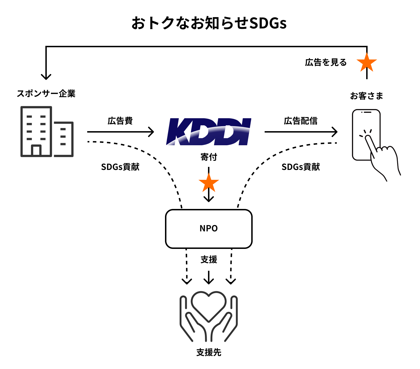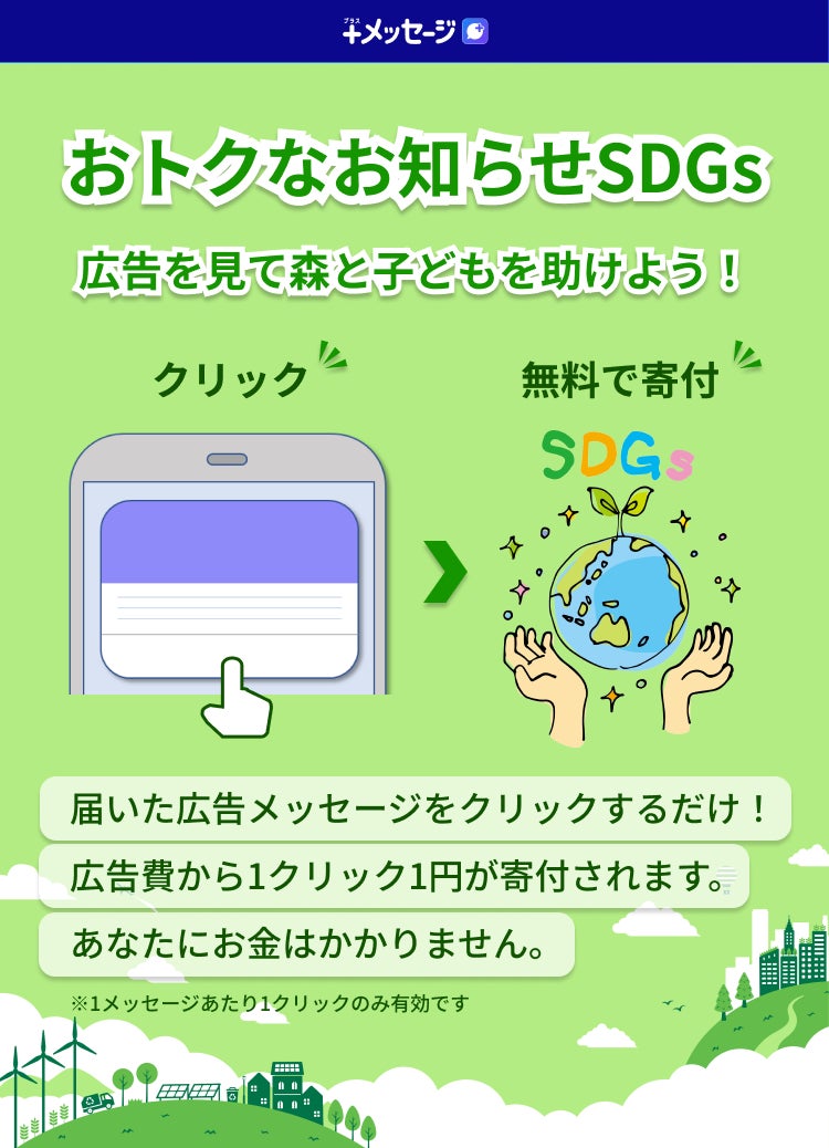 本サービスでは、au/UQ mobile/povoの「+メッセージ」をご利用で「おトクなお知らせ」SMSの配信に同意しているお客さまに、公式アカウント「おトクなお知らせSDGs」からスポンサー企業の広告メッセージを配信します。お客さまが広告メッセージをクリックすると、スポンサー企業がKDDIに支払う広告費から、1クリックあたり1円が森林保全・子ども支援団体に寄付されます。お客さまとスポンサー企業のどちらもかんたんにSDGsに貢献できるサービスです。