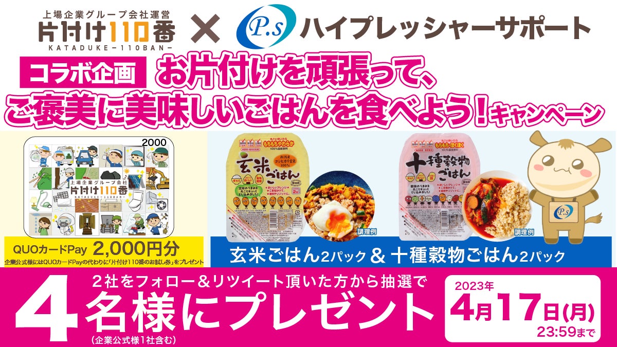 片付け110番を運営する「リベラルマーケティング株式会社」と、高圧食品の研究、製造、販売など行う「ハイプレッシャーサポート株式会社」は、Twitter上でコラボキャンペーンを企画!「お片付けを頑張って、ご褒美に美味しいごはんを食べよう!」をテーマに、十種穀物ごはん×2パック+玄米ごはん×2パック、QUOカードPay2,000円分のセットを抽選で4名様(企業公式様1社含む)にプレゼントします!