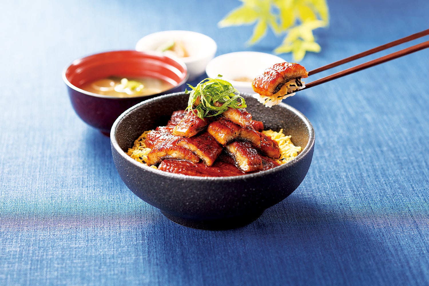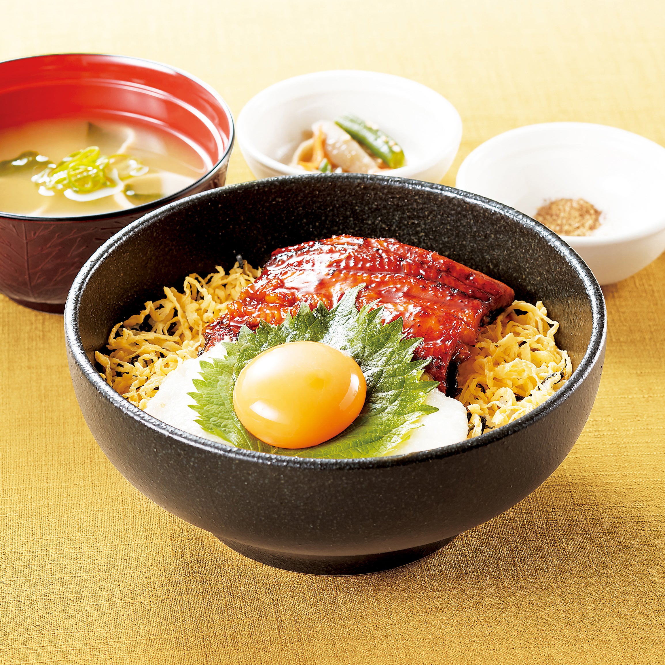 「とろろ月見のうなぎ丼」は、「うなぎ丼」にとろろと大葉、卵黄を合わせました。とろろと卵黄、コクのある甘めのたれが相性抜群で食べ進める手が止まりません。お好みで醤油をかけてお召し上がりください。