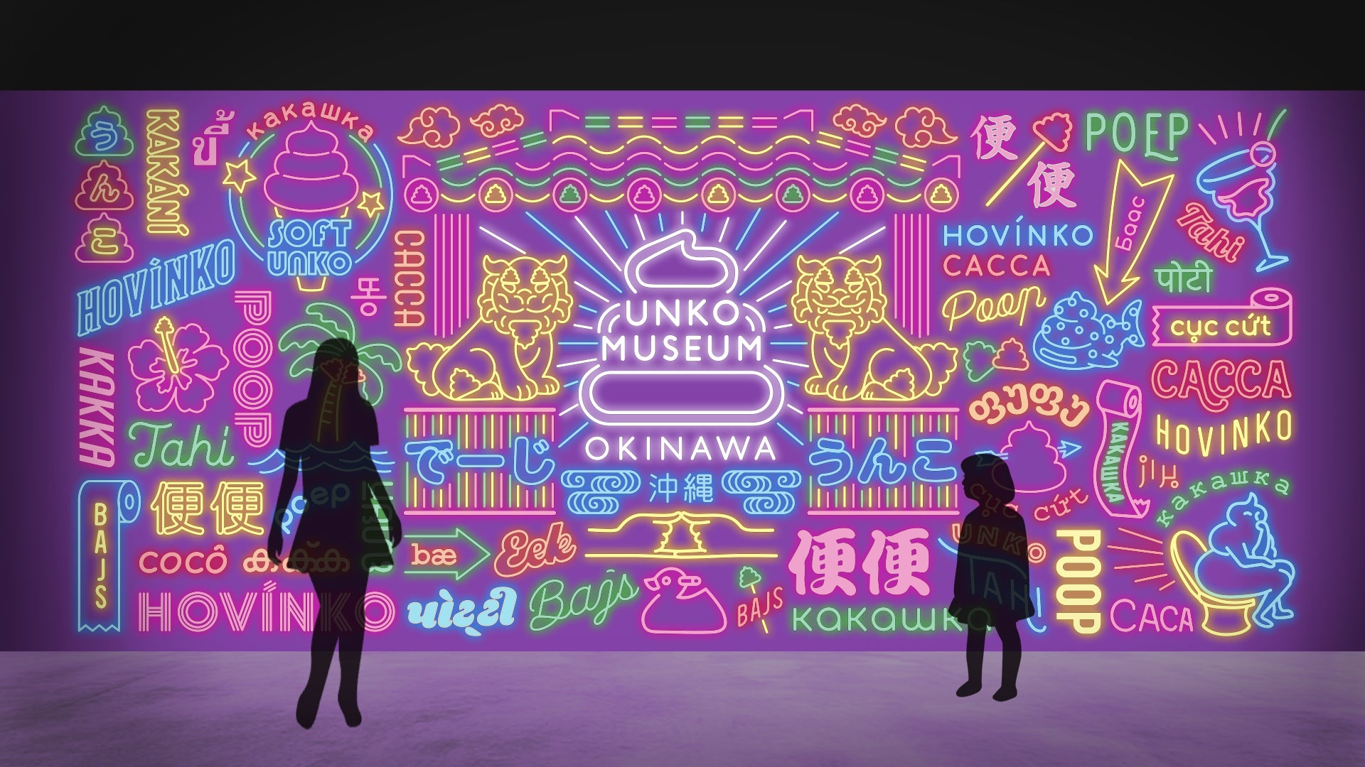 さまざまな言語の「うんこ」がネオンサインとして飾られています。世界中の“うん語”が可愛く光り輝くこの場所は、うんこミュージアムの中でも特に人気のフォトスポットです。シーサーやハイビスカス、ジンベエザメなど、沖縄を象徴するモチーフも登場し、「うんこミュージアム OKINAWA」ならではのデザインが魅力です。