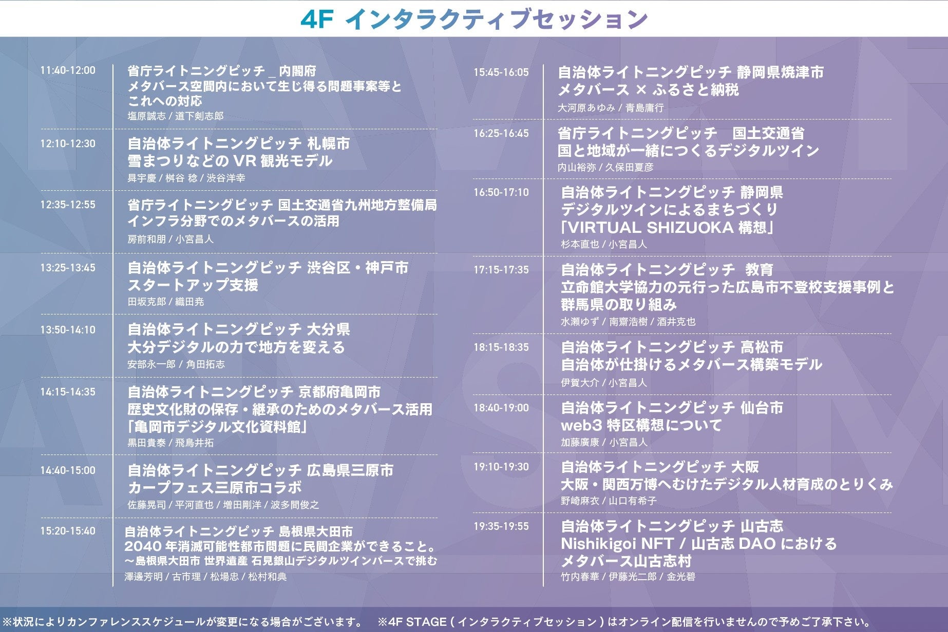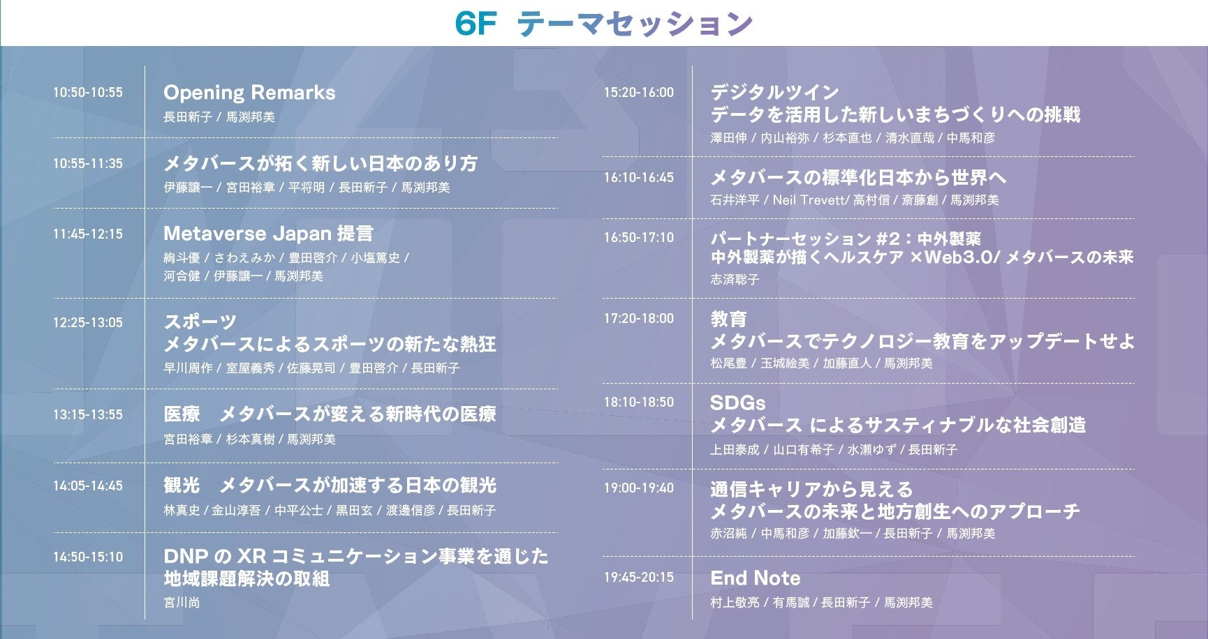 テーマセッションでは、衆議院議員自民党web3プロジェクトチーム座長の平将明氏が登壇する「メタバースが拓く新しい日本のあり方」を始め、教育 、医療 、SDGs 、観光 、スポーツなどのリアル × バーチャルを融合した産業用マルチバースやコミュニケーションバースについて語るセッションを14プログラム実施します。インタラクティブセッションでは内閣府知的財産戦略推進事務局参事官塩原誠志氏が登壇する「省庁ライトニングピッチ内閣府」のセッションが加わり、全16プログラムを実施します。