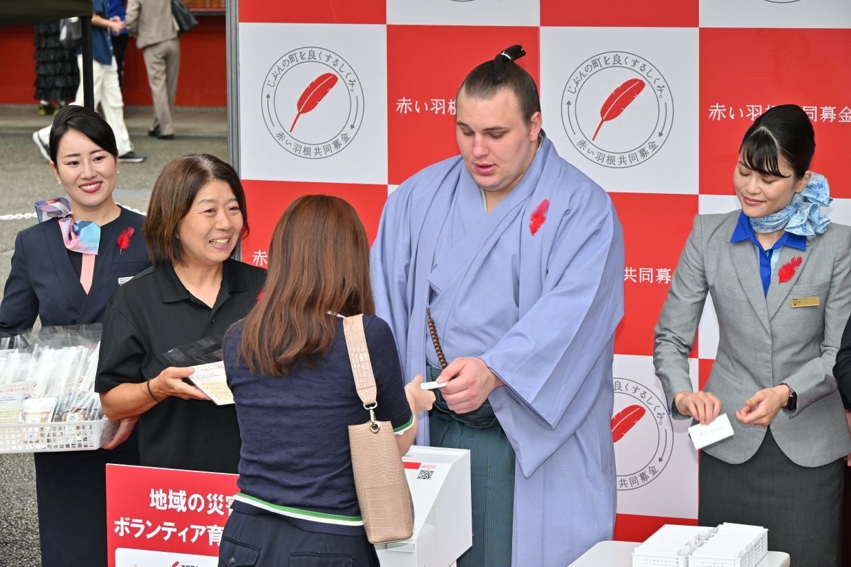 大河ドラマ「べらぼう〜蔦重栄華乃夢噺〜」(NHK)で勝川春章役を演じる俳優・前野朋哉さんや、大相撲九月場所で技能賞を受賞した安青錦関らが、共同募金の助成を受けて活動する団体の皆さんとペアを組み、募金の呼びかけを行いました。
