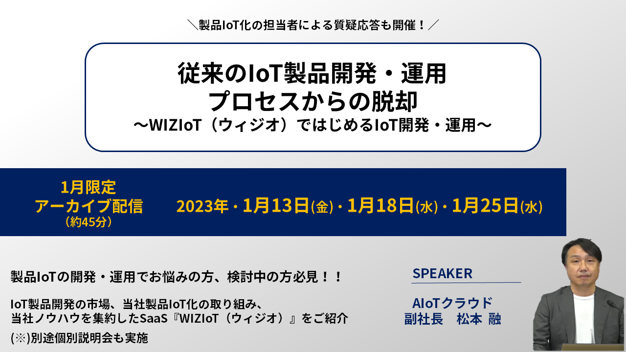 株式会社AIoTクラウド(本社:東京都江東区、代表取締役社長:石黒 豊)は、先般12月15日(木)にサービス提供開始しましたIoT開発運用SaaS『WIZIoT(ウィジオ)』の内容が凝縮したアーカイブ動画を、1月13日(金)より、1月限定配信(無料)することをご案内いたします。各日ともに当社社員による質疑応答の時間を用意しております。また興味を持たれた方には、個別説明会を調整させていただきます。IoT製品の開発・運用にご興味をお持ちの方、IoT製品を検討中の方は、是非この機会をご活用ください。